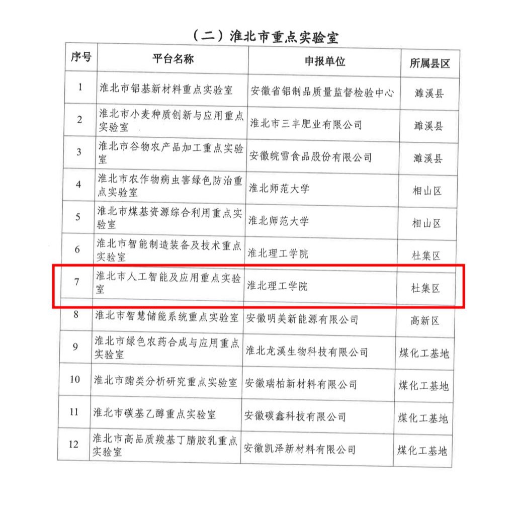 为进一步贯彻落实《关于加快推进科技创新平台建设的实施意见》(淮政办〔2023〕16号)精神,根据《关于印发<淮北市科技创新平台认定管理办法(试行)>和<淮北市科技创新平台绩效评价管理办法(试行)>的通知》(淮科〔2023〕16号)和《关于申报2024年度淮北市科技创新平台的通知》(淮科秘〔2024〕28号)文件精神,淮北市科技局经通知发布、组织申报、县区(园区)科技管理部门审核推荐、复核、专家评审、局党组会议研究同意、公示等程序,太阳成集团122ccvip申报的“淮北市人工智能及应用重点实验室”,获批立项建设。