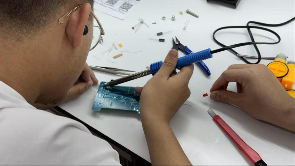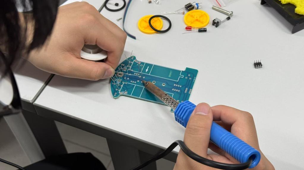 随后,员工们进入循迹小车制作环节。活动采用红色LED作为光源,光线通过地面反射到光敏电阻上,通过检测光敏电阻的阻值变化,判断小车是否行驶在白色区域。经过一个多小时的努力,一辆辆精巧的循迹小车在员工们手中诞生。