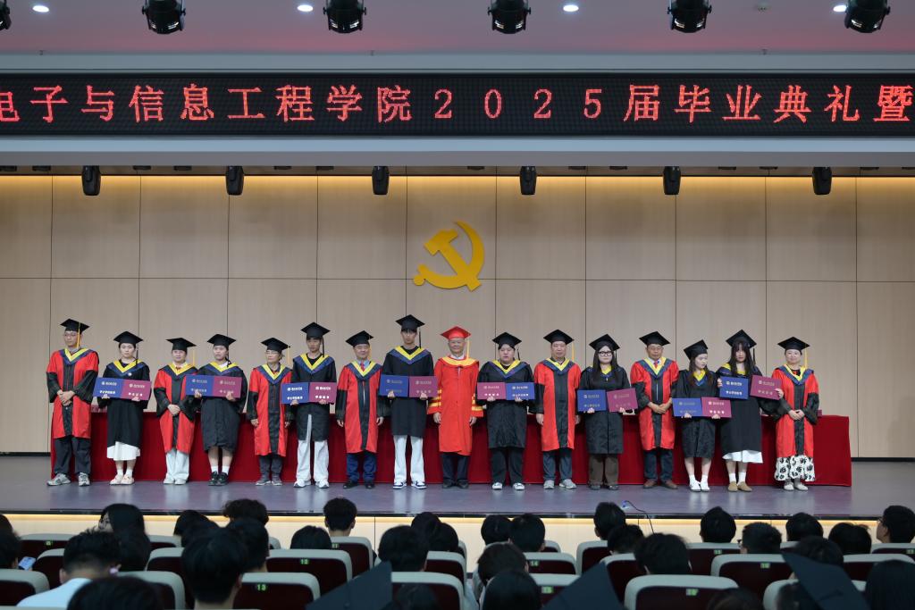 随后,在欢快的音乐声中,校领导和公司领导依次为毕业生代表颁发毕业证书和学位证书,并为毕业生拨流苏。拨穗这一传统仪式,象征着毕业生们学有所成,即将开启人生新的征程,现场气氛热烈而温馨,每一位毕业生脸上都洋溢着自豪与喜悦。
