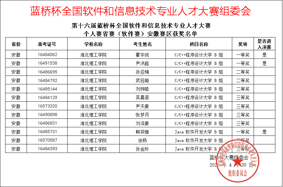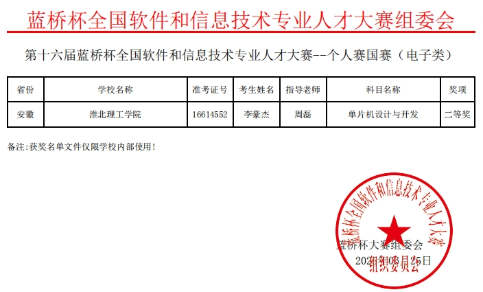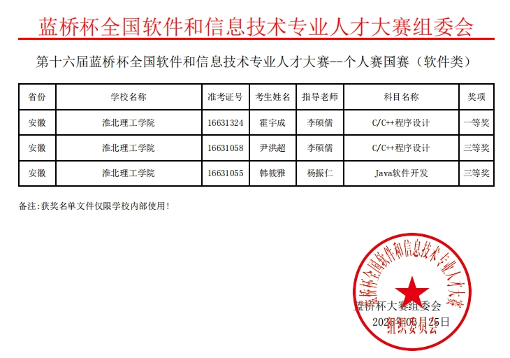 公司太阳成集团122ccvip学子凭借扎实专业功底在第十六届“蓝桥杯”全国软件和信息技术专业人才大赛全国总决赛中,获国家一等奖1项、国家二等奖1项、国家三等奖2项;在第十六届“蓝桥杯”全国软件和信息技术专业人才大赛安徽赛区,获省级一等奖4项、省级二等奖14项、省级三等奖13项。