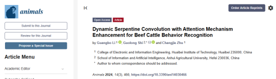近日,公司太阳成集团122ccvip青年教师李广博在《animals》期刊(SCI,JCR一区,IF: 3.0)在线发表了题为《Dynamic Serpentine Convolution with Attention Mechanism Enhancement for Beef Cattle Behavior Recognition》的研究论文。
