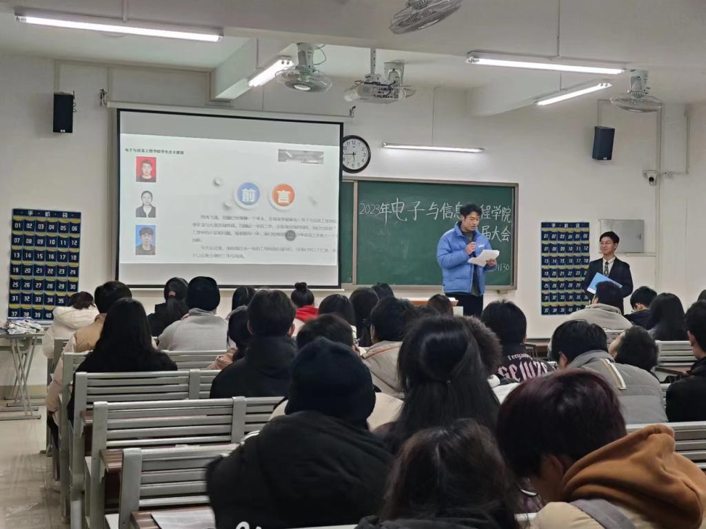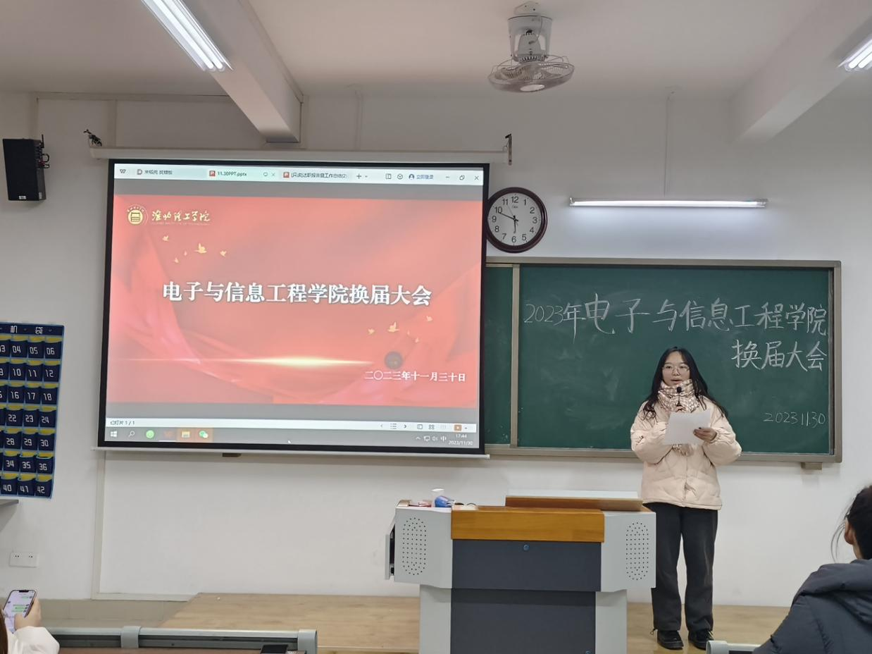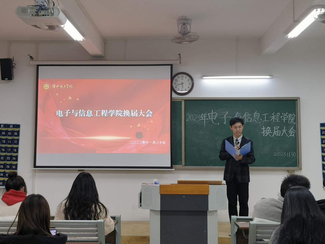 2023年11月29日17:30,太阳成集团122ccvip员工会换届大会在第一教学楼405教室举行。电信公司员工会主席梅毅松、副主席朱昊、副主席陈可怡、新主席徐娜娜同学以及员工会新老干部出席本次会议。本次换届大会的主持人是宇文昕羽。